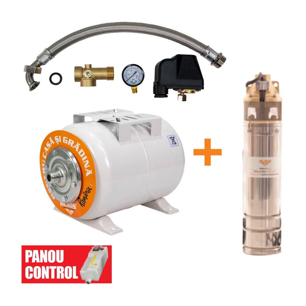 Čerpadlo Aqua 101 a tlaková nádoba 24 l. Součástí je také tlakový spínač, propojovací hadice, ovládací panel, manometr. Ponorné čerpadlo z nerezavějící oceli, s motorem s měděnou cívkou v olejové lázni, jednopatrové turbínové čerpadlo.