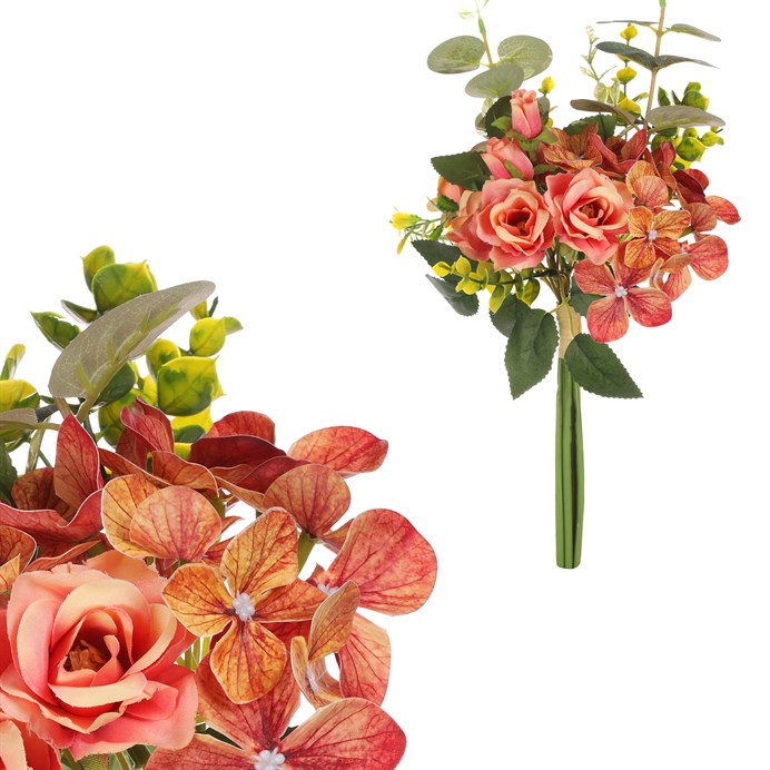 Dotaz na produktTato exkluzivní umělá kytice představuje harmonický mix květů hortenzie a růže v oranžovém odstínu, který je vhodný pro rozmanité příležitosti. Hodí se na výzdobu nejrůznějších oslav, společenských událostí a dalších. Může ale být i sama o sobě pěknou ozdobou u vás doma. Krása této kytice vyzařuje do okolí, a zvolením vhodné vázy ji ještě umocníte. Její nespornou výhodou je, že její trvalá krása nikdy neuvadne. Každý květ v této kytici je pečlivě vytvořen tak, aby vypadal jako živý a v plném rozkvětu. Získáte nádhernou květinovou výzdobu, která vydrží na věky bez nutnosti údržby a péče.