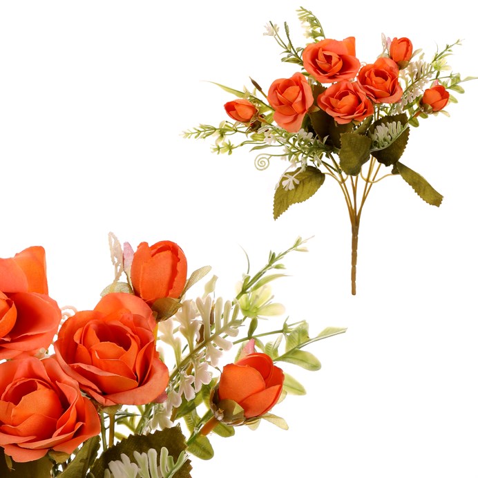 Dotaz na produktKytice umělých růží s oranžovou barvou květů bude působivou květinovou dekorací. Její krása časem neuvadne a můžete tak využívat tuto umělou květinu opakovaně, nebo ji mít jako trvalou ozdobu. Vynikne sama o sobě v pěkné váze, nebo může být součástí ucelené květinové výzdoby pro různé oslavy, či jiné společenské události. Nemusíte si dělat starosti s údržbou a zaléváním, neboť jako umělá, nepotřebuje žádnou péči, a přitom vypadá fantasticky. Je věrohodnou kopií živé varianty, a tak při letmém pohledu na ní, ji ani nerozeznáte od originálu.