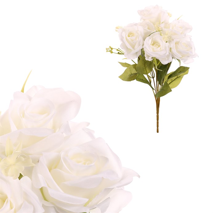 Dotaz na produktKytice umělých růží s bílou barvou květů bude působivou květinovou dekorací. Její krása časem neuvadne a můžete tak využívat tuto umělou květinu opakovaně, nebo ji mít jako trvalou ozdobu. Vynikne sama o sobě v pěkné váze, nebo může být součástí ucelené květinové výzdoby pro různé oslavy, či jiné společenské události. Nemusíte si dělat starosti s údržbou a zaléváním, neboť jako umělá, nepotřebuje žádnou péči, a přitom vypadá fantasticky. Je věrohodnou kopií živé varianty, a tak při letmém pohledu na ní, ji ani nerozeznáte od originálu.