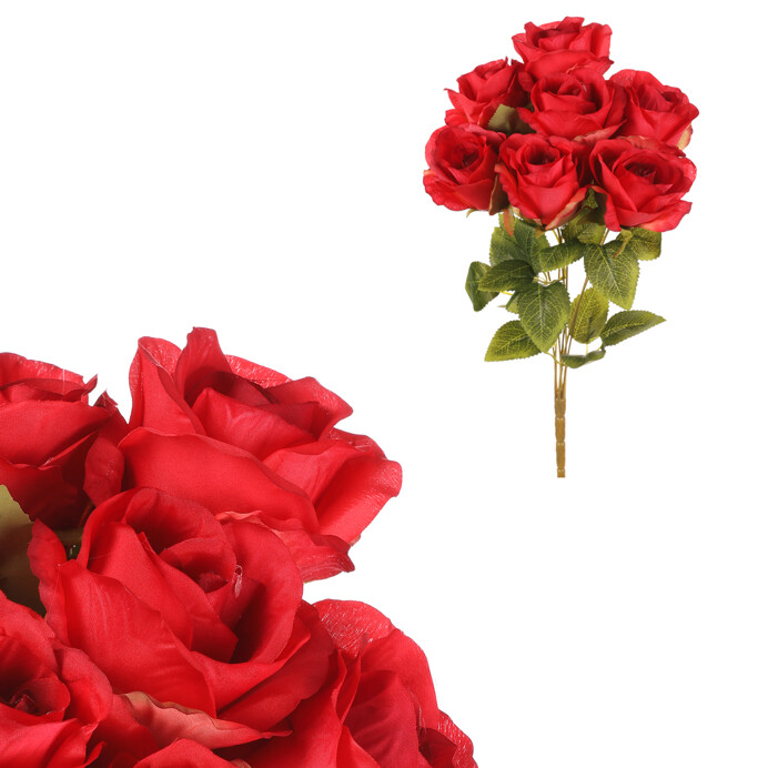 Dotaz na produktKytice umělých růží s červenou barvou květů bude působivou květinovou dekorací. Její krása časem neuvadne a můžete tak využívat tuto umělou květinu opakovaně, nebo ji mít jako trvalou ozdobu. Vynikne sama o sobě v pěkné váze, nebo může být součástí ucelené květinové výzdoby pro různé oslavy, či jiné společenské události. Nemusíte si dělat starosti s údržbou a zaléváním, neboť jako umělá, nepotřebuje žádnou péči, a přitom vypadá fantasticky. Je věrohodnou kopií živé varianty, a tak při letmém pohledu na ní, ji ani nerozeznáte od originálu.