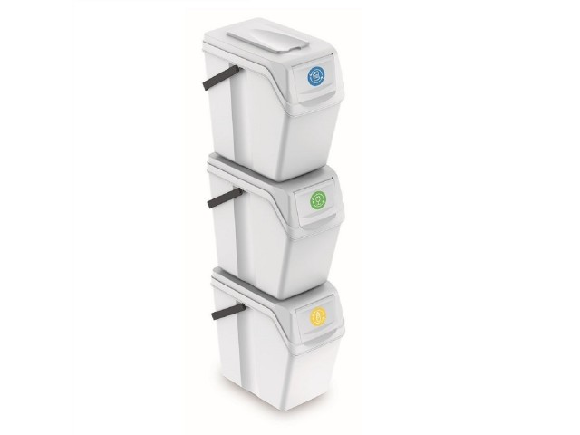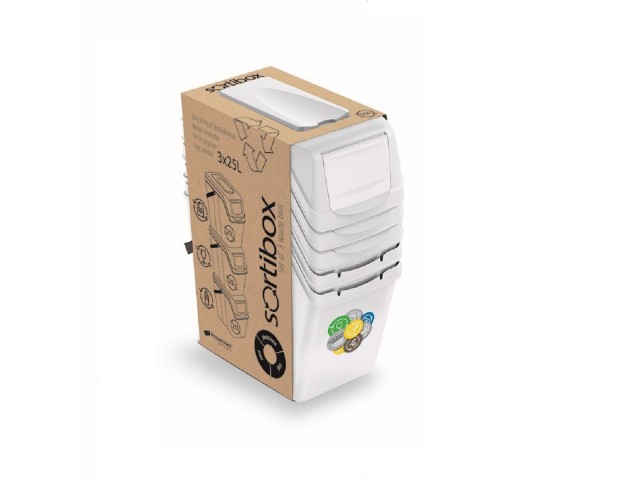 Sada 3 košů na třídění odpadu barva popelavě šedýt 3x25L Sortibox. Jsou modulární, takže je lze volně skládat na sebe. Jsou vyrobeny z odolného plastu ABS.