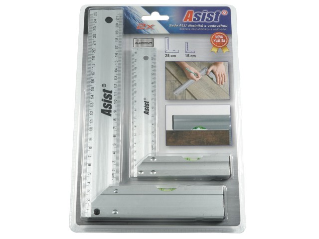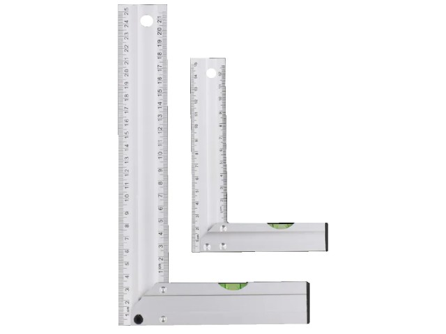 Sada 2ks ALU úhelníků pro precizní práci v dílně i v domácnosti. Rozměr 15cm a 25cm, čitelná stupnice s rozlišením 1mm, vhodná pro kontrolu vnějších i vnitřních pravých úhlů nebo pro označení kolmých řezů. Každý úhelník má integrovanou bublinkovou vodováhu.