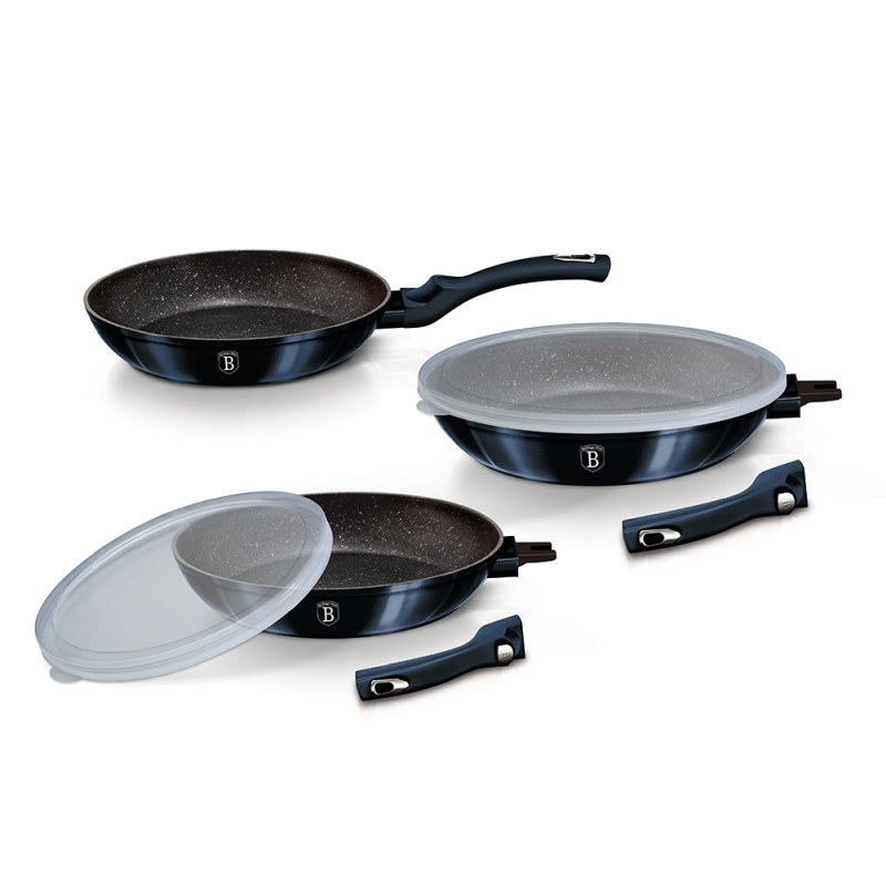 Dotaz na produkt Na splátky ještě dnesMultifunkční sada pánví BerlingerHaus z kolekce Aquamarine Metallic Line zaujme nejen krásným metalickým designem, ale především špičkovými funkčními vlastnostmi. Díky 3vrstvému nepřilnavému mramorovému povrchu se potraviny nepřipalují a pánve se snadno čistí. Dvě pánve navíc disponují odnímatelnou rukojetí, takže je můžete bez obav použít i pro zapékání v troubě do 220 °C.