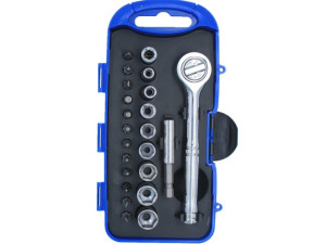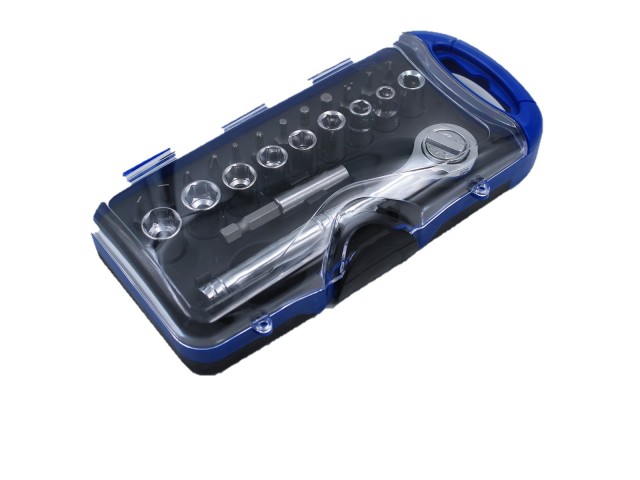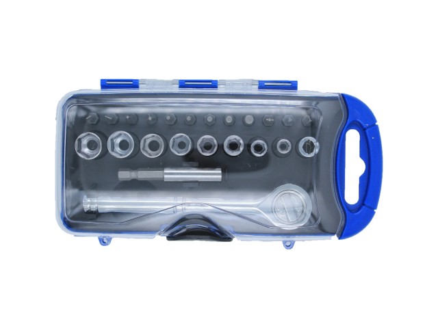 1x ráčna 1/4, magnetický prodlužovací nástavec, 8x nástrčné hlavice 5-12mm + adaptér, 12x bity Chrom Vanadium, v praktickém boxu