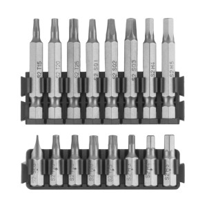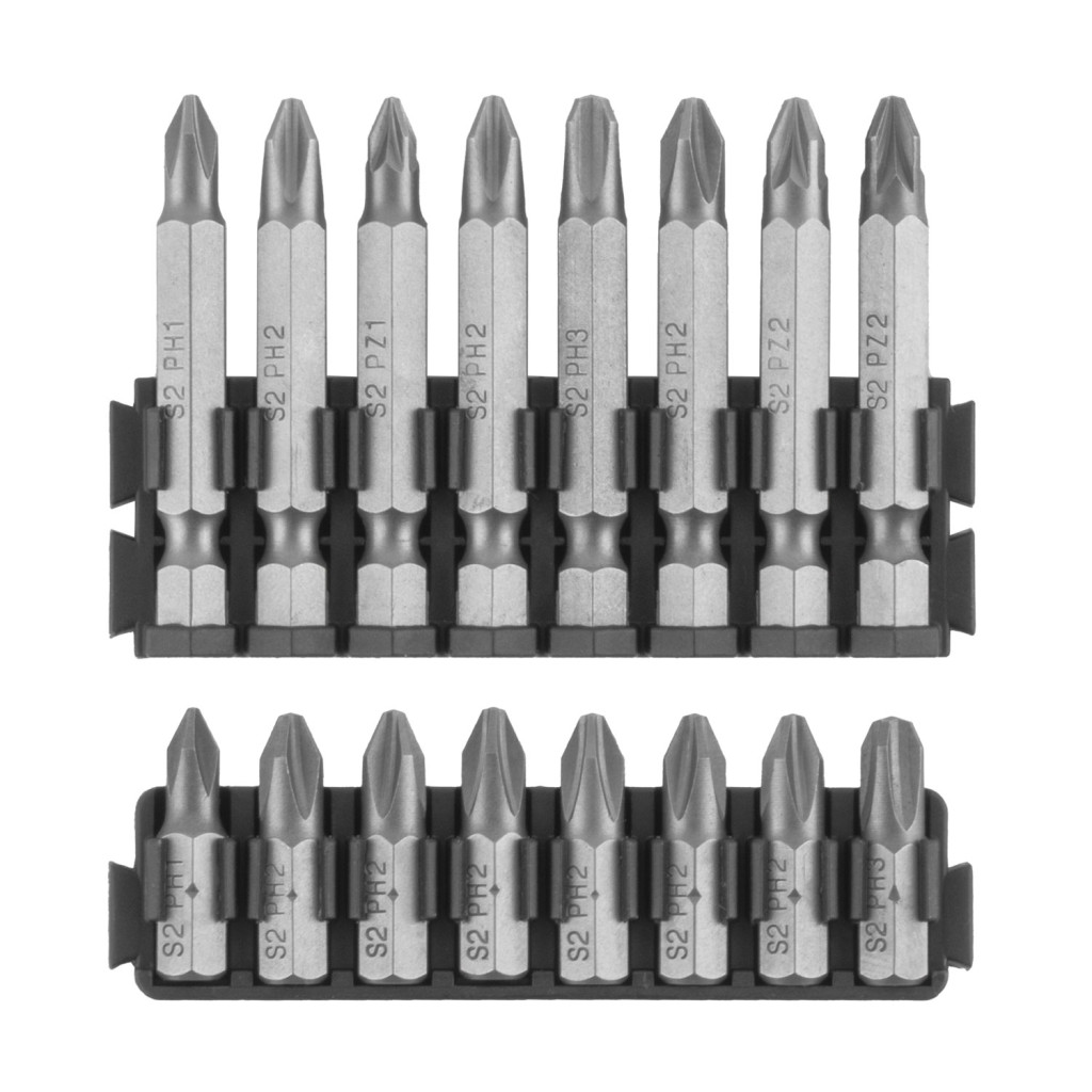 16 ks 50mm bitů: Phillips: PH1, PH2x3, PH3, Pozi: PZ1, PZ2x2, Torx: T15, T20, T25, Square: SQ1, SQ2, SQ3, Imbus: H4, H5