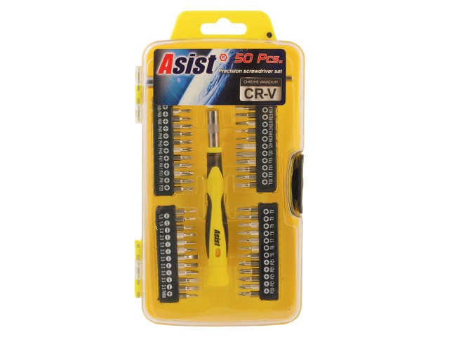 50-dílná sada minišroubováků ASIST pro jemnou mechaniku, kvalitní materiál ChromVanadium s prodlužovacím kusem na nepřístupná místa, 13x Torx, 6x Hex bitů, 18 ks PZ a PH bitů a 11 ks plochých bitů, v praktickém boxu.