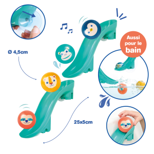Dotaz na produktTobogány s míčky do vany promění každé koupání v zábavnou vodní dráhu, kterou si dítě může samo sestavit a měnit. Díky silným přísavkám se jednotlivé díly snadno upevní na hladké povrchy (obklady, vanu) a drží stabilně i během hry. Dítě pozoruje, jak se míčky pohybují po dráze, zkouší různé varianty a postupně chápe princip příčina–následek. Čtyři plovoucí míčky s rolničkou při jízdě po skluzavce jemně cinkají a podněcují další objevování.