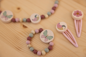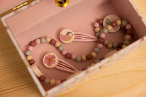 Dotaz na produktSadu krásných dřevěných šperků pro malou parádnici tvoří korálky na krk, náramek a dvě sponky do vlasů. Ke šperkům je možné dokoupit i samostatně prodávanou hudební šperkovnici.