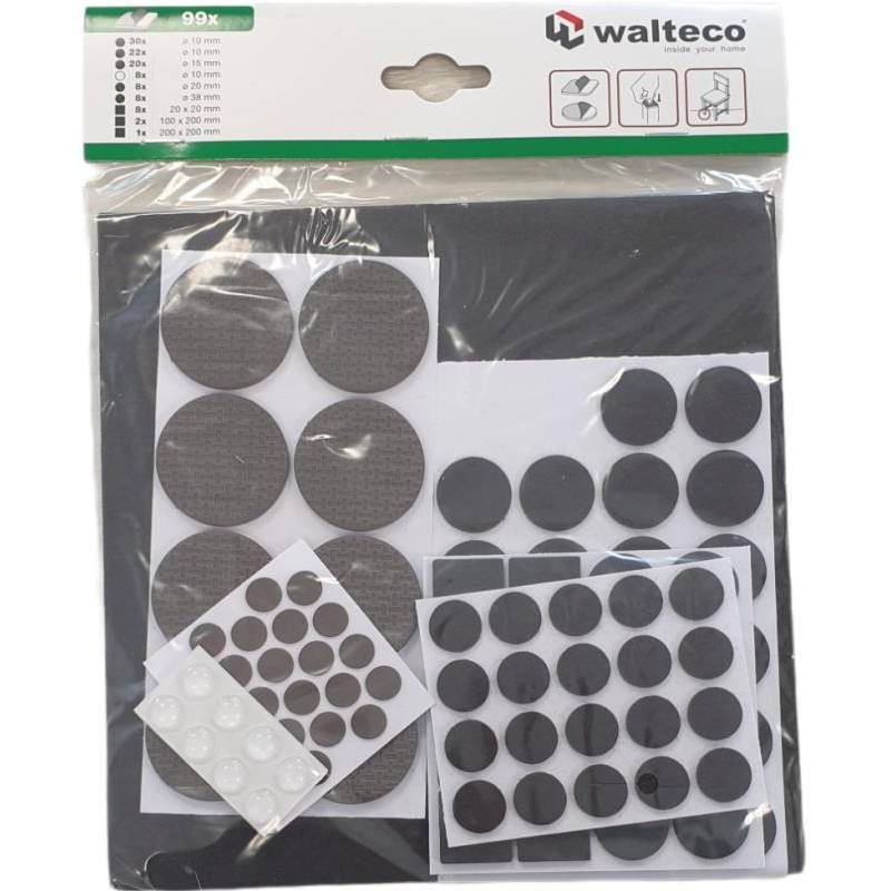 Sada obsahuje:Filcové podložky: O 22 mm - 22x, O 15 mm - 20x, 100x200 mm - 2x, 200x200 mm - 1xPodložky EVA: 20x20 mm - 8x, O 20 mm - 8x, O 10 mm - 22x, O 38 mm - 8xTlumič dvířek: O 10 mm - 8x