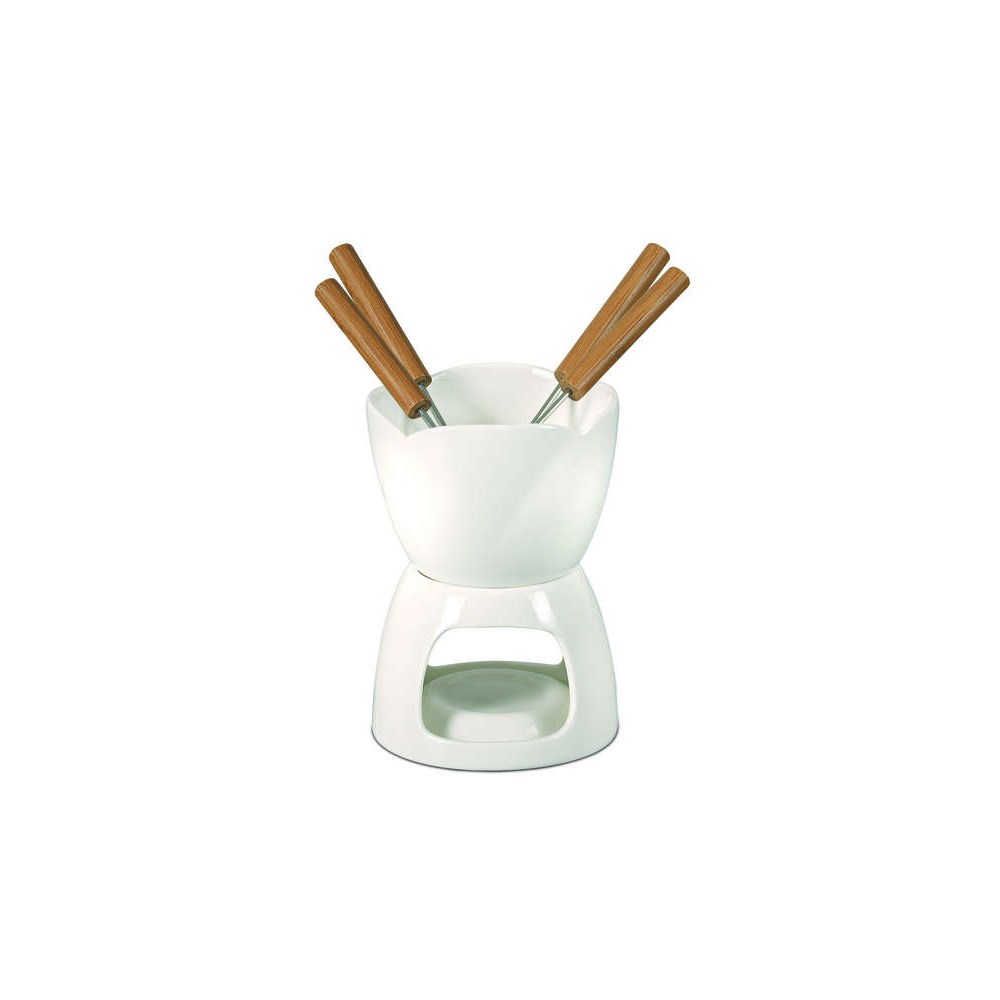 Dotaz na produkt6dílná sada Fondue COLLEZIONE BIANCA, sada obsahuje: 1x keramickou misku o průměru 10,5 cm a výšce 8 cm, 1x keramický stojánek na svíčku (průměr 10,5 cm, výška 7,5 cm), 4x nerezovou vidličku délky 17,5 cm s bambusovou rukojetí.