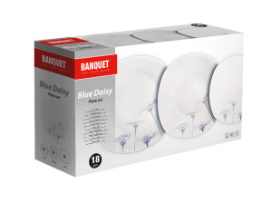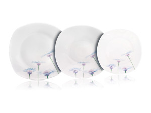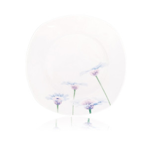 Talířová sada square, v bílé barvě s dekorem BLUE DAISY, je vyrobena z porcelánu.