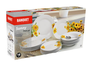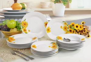 18dílná talířová sada SUNNY s dekorem slunečnic, je vyrobena z porcelánu.