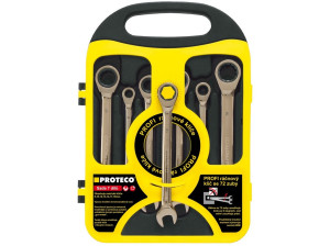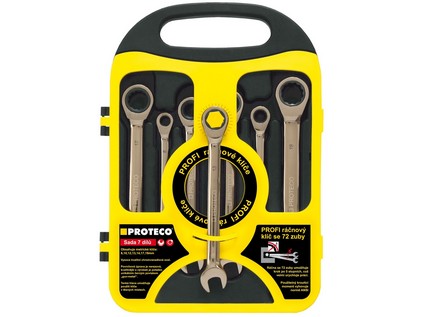 Dotaz na produktSada 7-dílná ráčnových klíčů s kloubem v plastovém držáku je vhodná pro použití zejména v místech, kde je obtížný přístup a nelze tak využít standardní ráčnu. Klíče jsou vyrobeny z chrom-vanadiové oceli. Krok ráčny je 5°. Utahovací moment vyhovuje normě ANSI. Výhody a chrakteristikcé znaky - 7-dílná sada klíčů ráčnových - Vyrobeny z chrom-vanadiové oceli - Utahovací moment vyhovuje normě ANSI - Obsah balení: Ráčnové klíče 8, 10, 12, 13, 14, 17 a 19 mm (základní rozměr může být nahrazen)