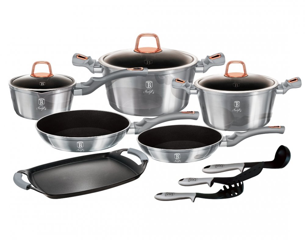 Sada obsahuje všechny základní nádoby pro každodenní přípravu různých pokrmů – od dušení a vaření polévek po smažení či grilování. Najdete v ní 2 pánve, 2 hrnce s poklicí, rendlík s poklicí, grilovací desku s odnímatelnými silikonovými rukojeťmi a 3 kusy kuchyňského náčiní. Díky různým velikostem kastrolů, pánví a rendlíku je ideální pro vaření více jídel současně. Sadu použijete na všechny druhy sporáků i do trouby. Je vhodná také do myčky nádobí, což usnadňuje údržbu a šetří čas.