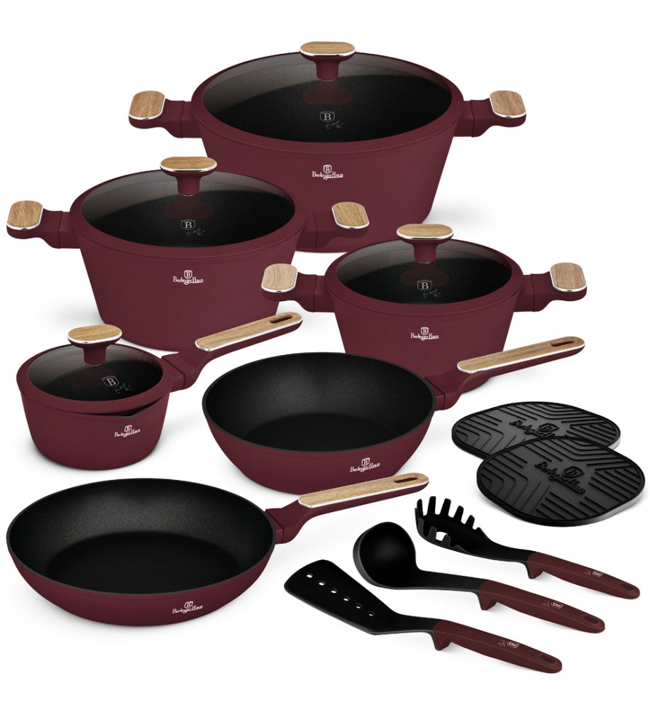 Vylaďte svou kuchyni do posledního detailu se sadou nádobí Berlingerhaus Leonardo Nordic Collection. Elegantní matná bordó a jemné dřevěné detaily jsou tím pravým doplňkem do každé stylové kuchyně. 15 kusů nádobí pokryje vaření od snídaně pro dva až po nedělní rodinný oběd.