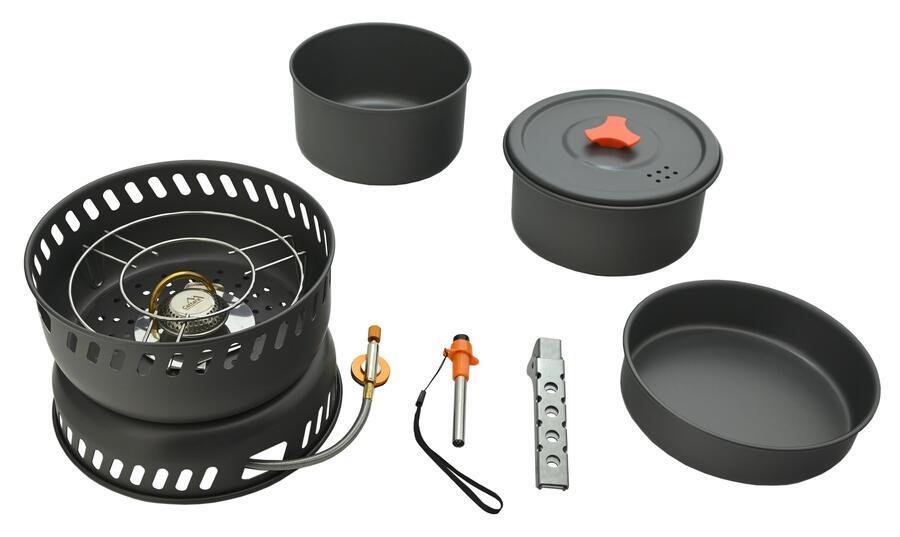 Kromě vařiče najdete v balení také pánvičku, dva hrnce, pokličku a Gripper. Gripper funguje jako kleště pro zaháknutí za okraj hrnce a vytvoří praktickou rukojeť. Vařič zabere málo místa. Stačí ho složit a sbalit si ho na cesty. Hořák obdržíte v textilním pouzdře a spolu s ostatním příslušenstvím se nachází v sítěné tašce.