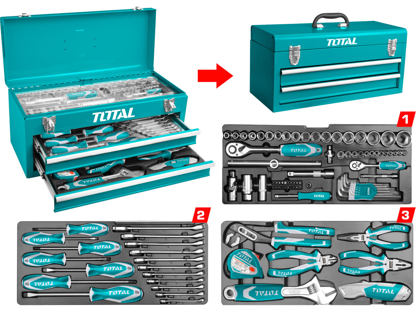 Dotaz na produkt Na splátky ještě dnesProfesionální sada nářadí značky TOTAL. Vše, co potřebujete pro práci v dílně, nebo jako řemeslník pro nejrůznější podnikatelské aktivity. Industriální kvalita a uzamykatelný ocelový box se dvěma šuplíky.