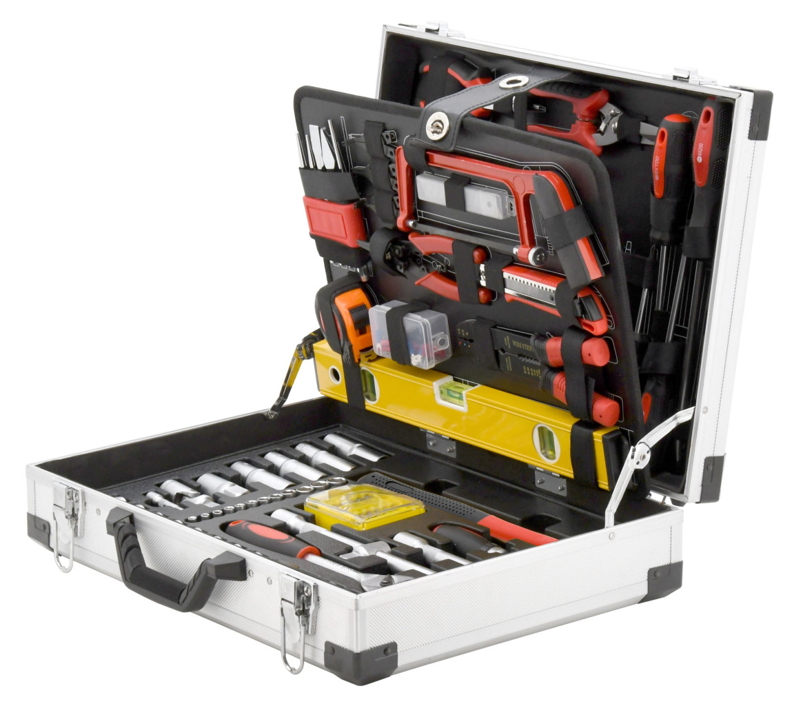 Sada nářadí ALU-PROFI značky Compass obsahuje 139 kusů nářadí. V propracovaném kufříku z odolného kovu tak najdete veškeré běžně potřebné nářadí včetně očkoplochých klíčů, vodováhy, goly, pilky, zalamovacího nože, kleští, elektrikářské zkoušečky a jiné.