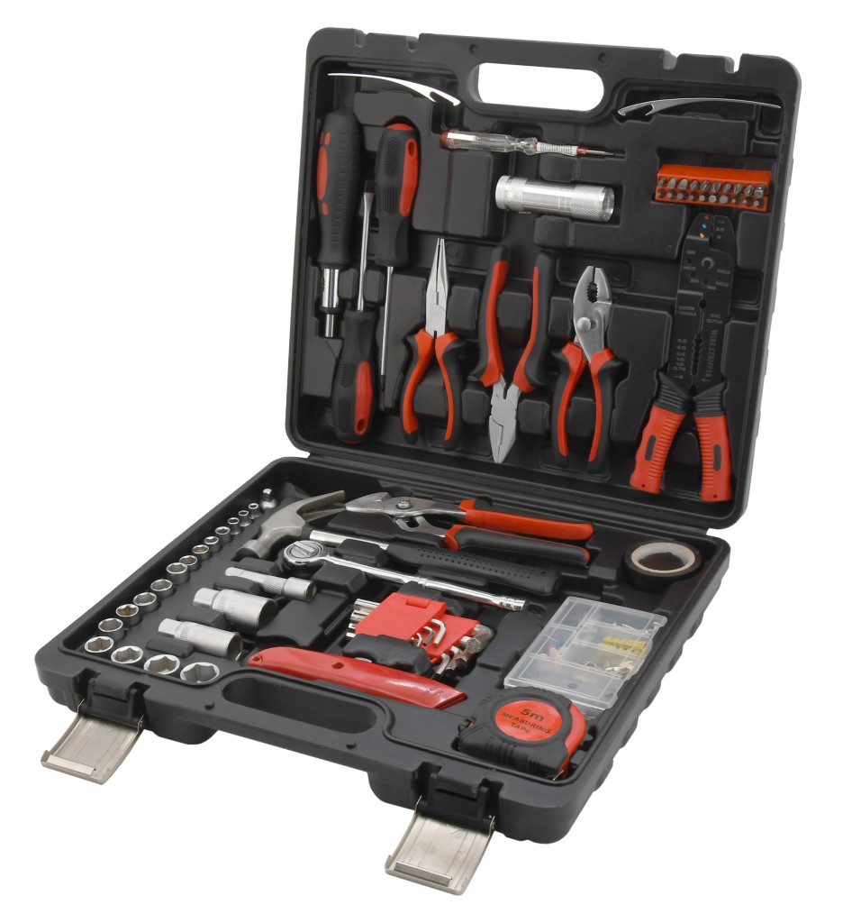 Sada obsahuje ergonomické šroubováky, imbusové klíče, žiletkový nůž, nejběžnější typy kleští včetně elektrikářských, kladivo, 3/8" ráčnu s nástavci, LED svítilnu, šroubovák na bity včetně 20 ks bitů, svinovací metr o délce 5 m, izolační pásku a další. Mimojiné je sada opatřena pouzdrem s 92 ks spojovacího materiálu.
