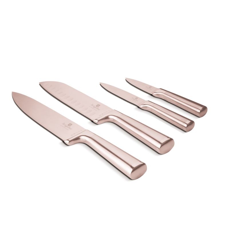 4 nože z vysoce kvalitní nerezové oceli využijete na rozřezávání a krájení různých potravin. Najdete mezi nimi kuchařský, užitkový a okrajovací nůž a nůž Santoku. Elegantní design kolekce Taupe doplní každou kuchyni.