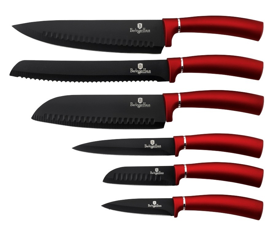 Dotaz na produktElegantní sada edice Burgundy Metallic Line obsahuje 6 nožů, které mají čepele z nerezové oceli s nepřilnavým antibakteriálním povrchem Diamond. Antibakteriální povrch neničí vitamíny v krájených potravinách a nepřenáší jejich pachy. Ergonomicky tvarované měkčené rukojeti zajišťují pevný úchop.