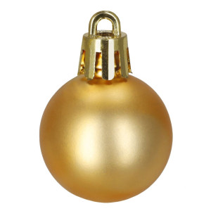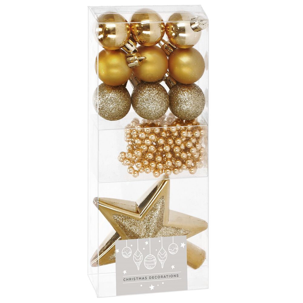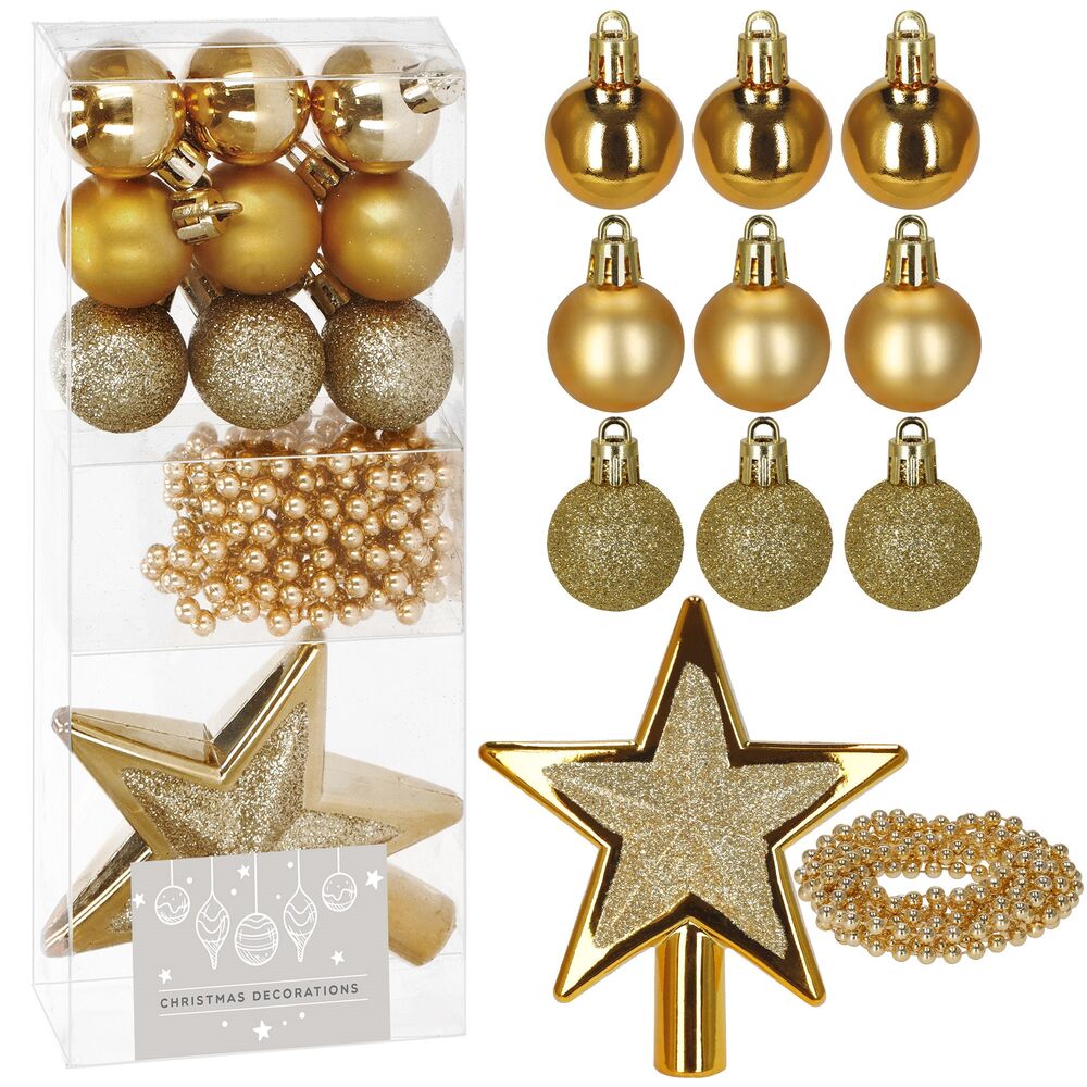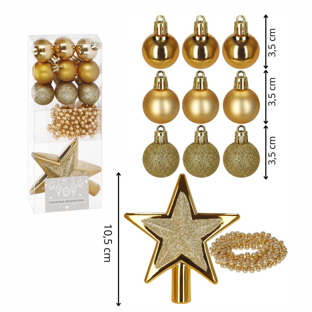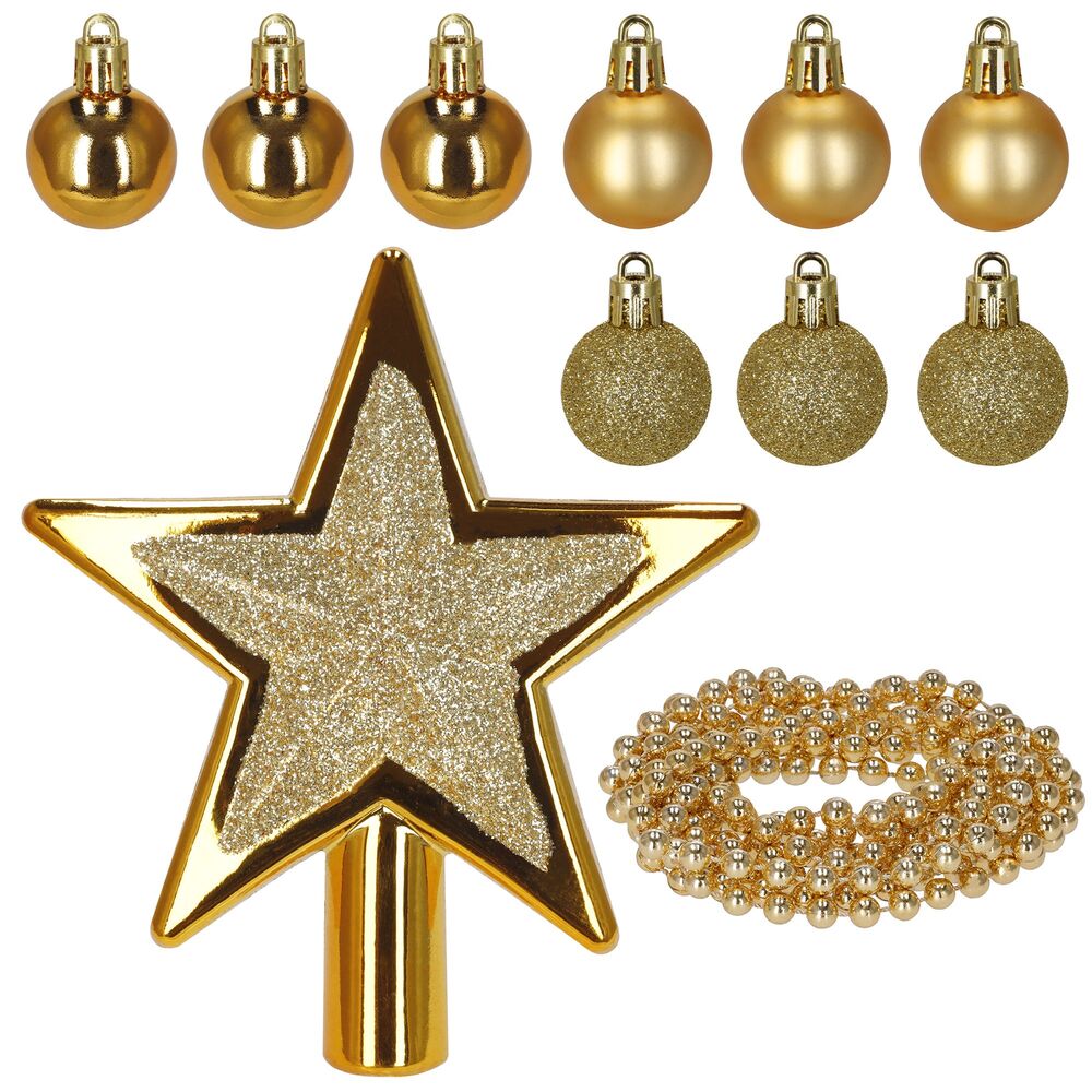 Kompletní sada vánočních ozdob v elegantní zlaté barvě dodá stromku jednotný a slavnostní vzhled. Obsahuje baňky, třpytivou hvězdu a dekorativní girlandu v kombinaci matného, lesklého a třpytivého provedení. Ozdoby jsou vyrobeny z nerozbitného plastu, mají poutka a přiloženou zlatou šňůrku pro snadné zavěšení. Ideální volba pro stylově sladěnou výzdobu.