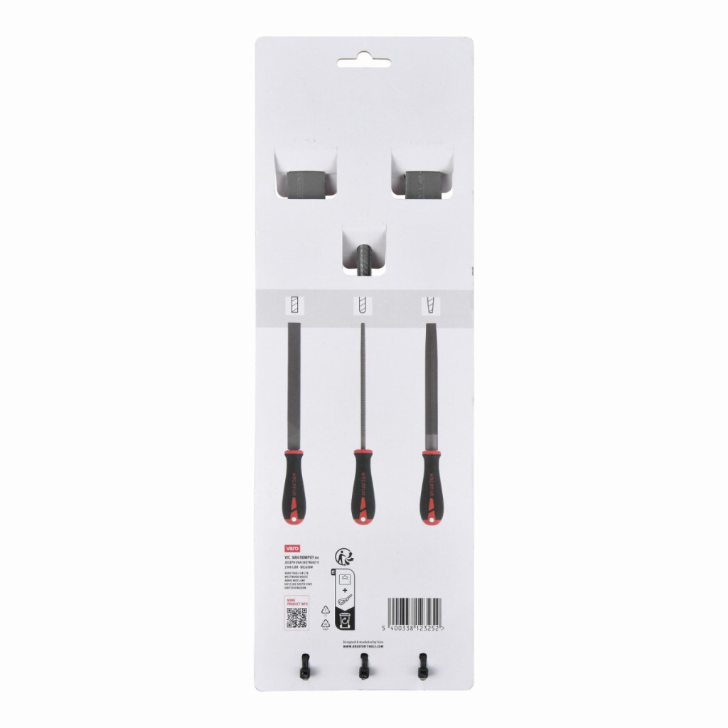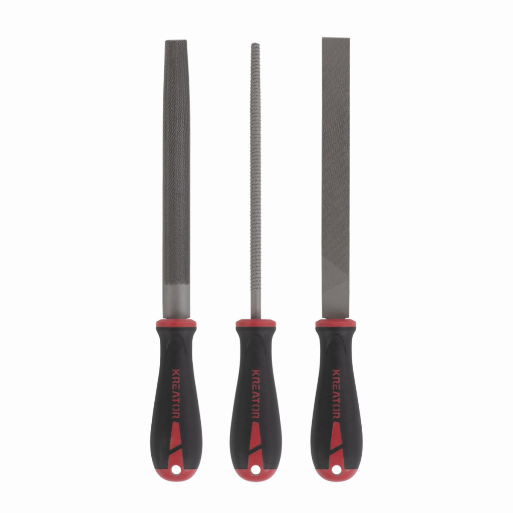 Dotaz na produktTato třídílná sada pilníků KRTH23001 z naší řady Kreator obsahuje plochý, kulatý a půlkulatý pilník. S touto sadou můžete pilovat a krásně upravovat téměř jakýkoli předmět nebo povrch. Každý z nich je vybaven čepelí o délce 250 mm a ergonomickou rukojetí s měkkým povrchem a protiskluzovou vrstvou. Rukojeť má navíc integrované závěsné oko pro snadné skladování.