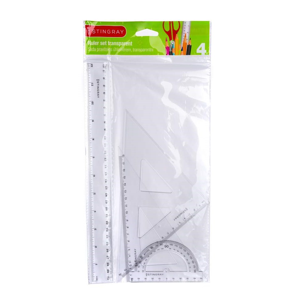 Dotaz na produktSada transparentních pravítek 4 ks obsahuje: 2x trojúhelník 16 a 18 cm, 1x úhloměr se základnou 10 cm, 1x pravítko 30 cm s měřítkem.