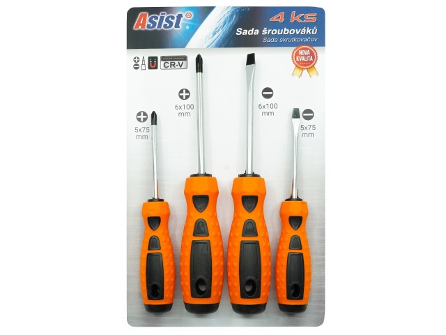 2x křížový, 2x rovný, délka 75 a 100mm, materiál chrom-vanadium, magnetický hrot, protiskluzová rukojeť