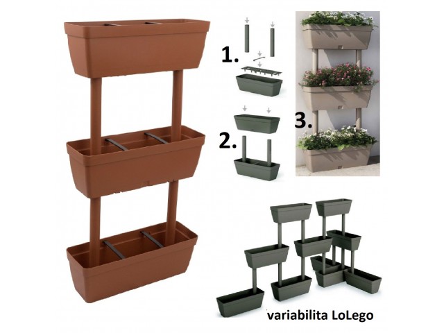 systém LoLEGO, možno sestavovat více truhlíků do různých sestav, ideální pro květinovou nebo bylinkovou zahrádku na terase či balkóně, jedna sestava =3x samozavlažovací truhlík a 4x spojovací trubky, vyrobeno v Itálii