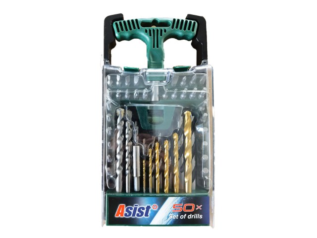 Sada ASIST 50dílů, 6x vrták HSS z rychlořezné oceli, 5x vrták do dřeva, 6x vrták do betonu s diamantovým hrotem, 30x bity + magnetický držák, šroubovací rukojeť ve tvaru "T", vše v praktickém kufříku, Nejlevnější na trhu