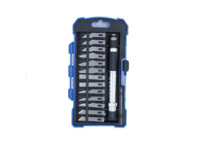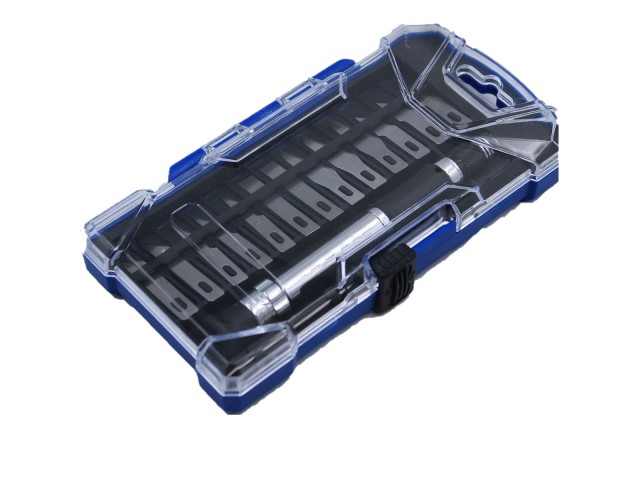 13x ostré tvarové čepele, uhlíková ocel, univerzální rukojeť, velice ostré břity pro precizní práci v dílně i v domácnosti, v praktickém boxu