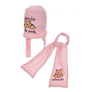 Souprava šála a čepice na zavazování Medvídek Pú. V provedení růžová. 100% acrylyc. Oficiální licence, Sun City, Francie.