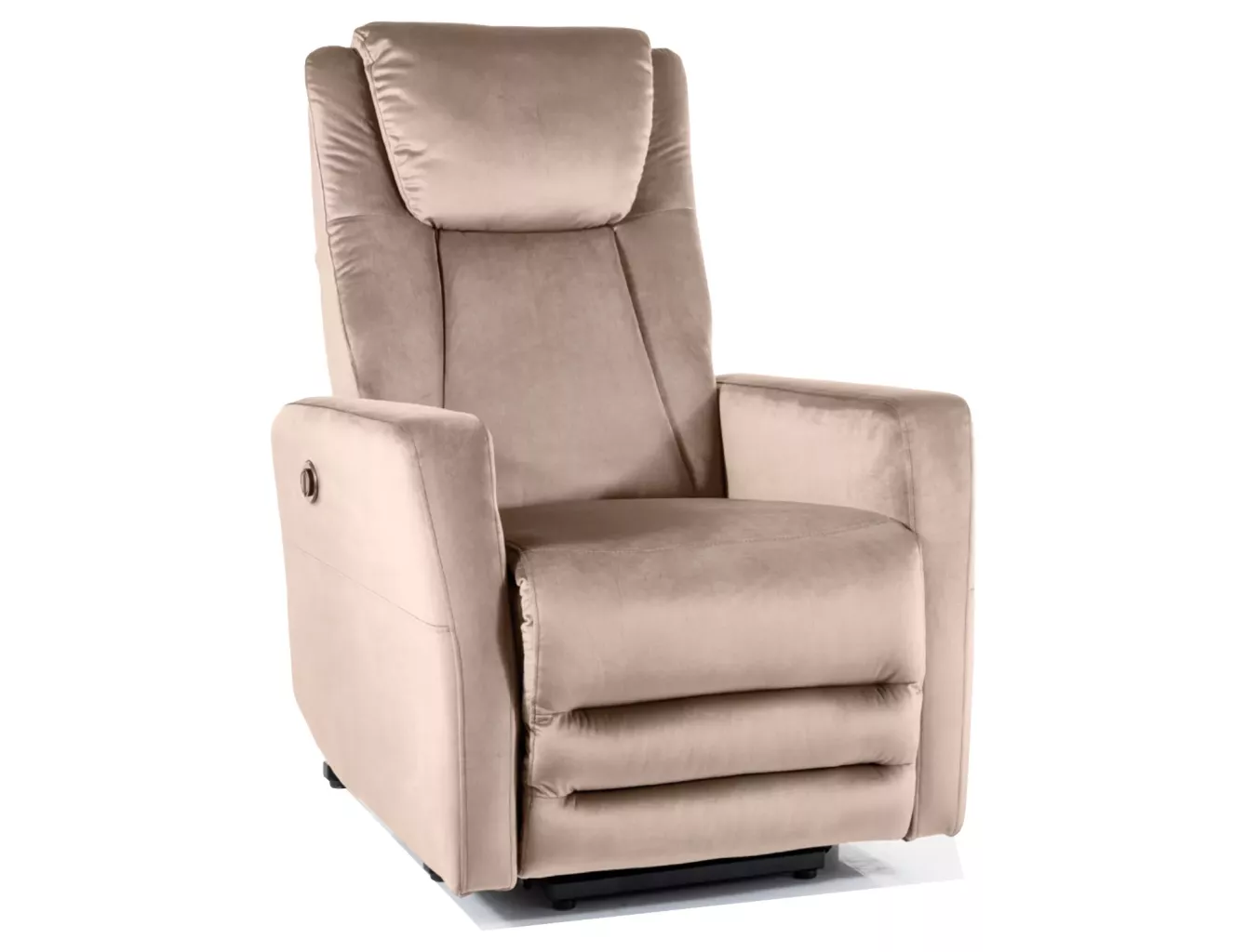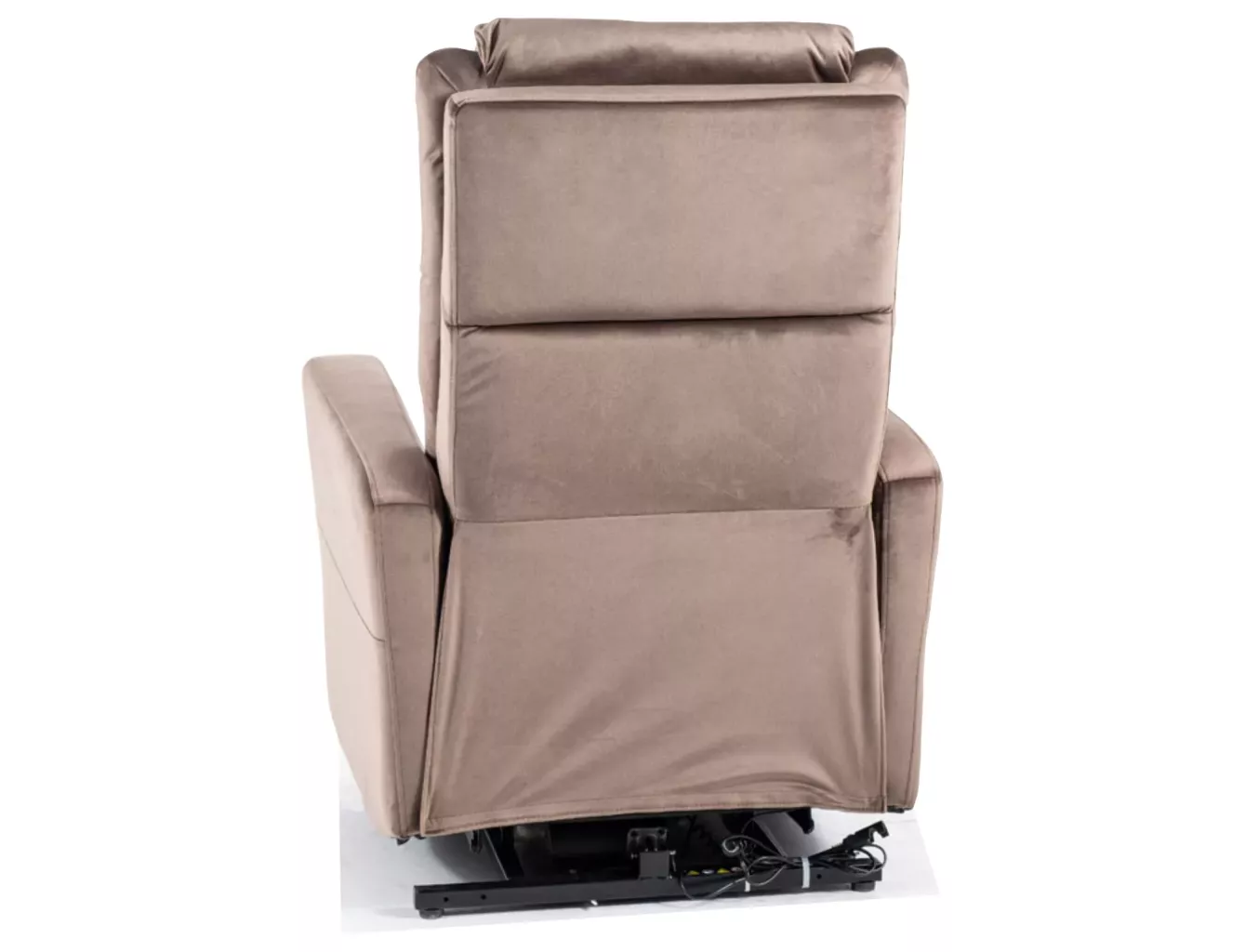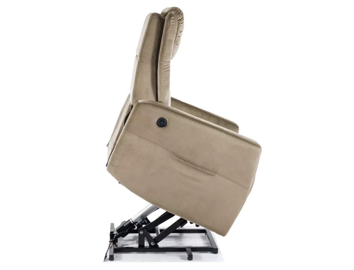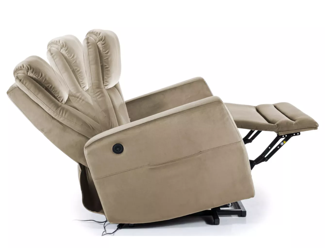 Dotaz na produkt Na splátky ještě dnesElektricky polohovací vzpřímená židle, nastavitelná opěrka hlavy, sametová látka Bluvel 40, barva: tmavě béžová. Dálkové ovládání s kabelem pro ovládání sklonu, kapsa a USB nabíjecí zásuvka na pravé straně.
