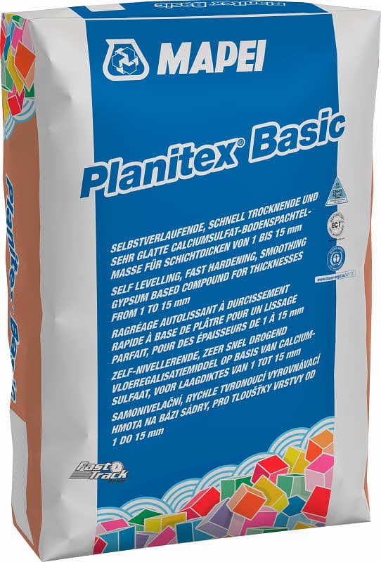 Planitex Basic je samonivelační, rychle vysychající podlahová stěrka velmi jemné granulometrie na bázi síranu vápenatého (syntetické sádry) pro tloušťky vrstvy od 1 do 15 mm.