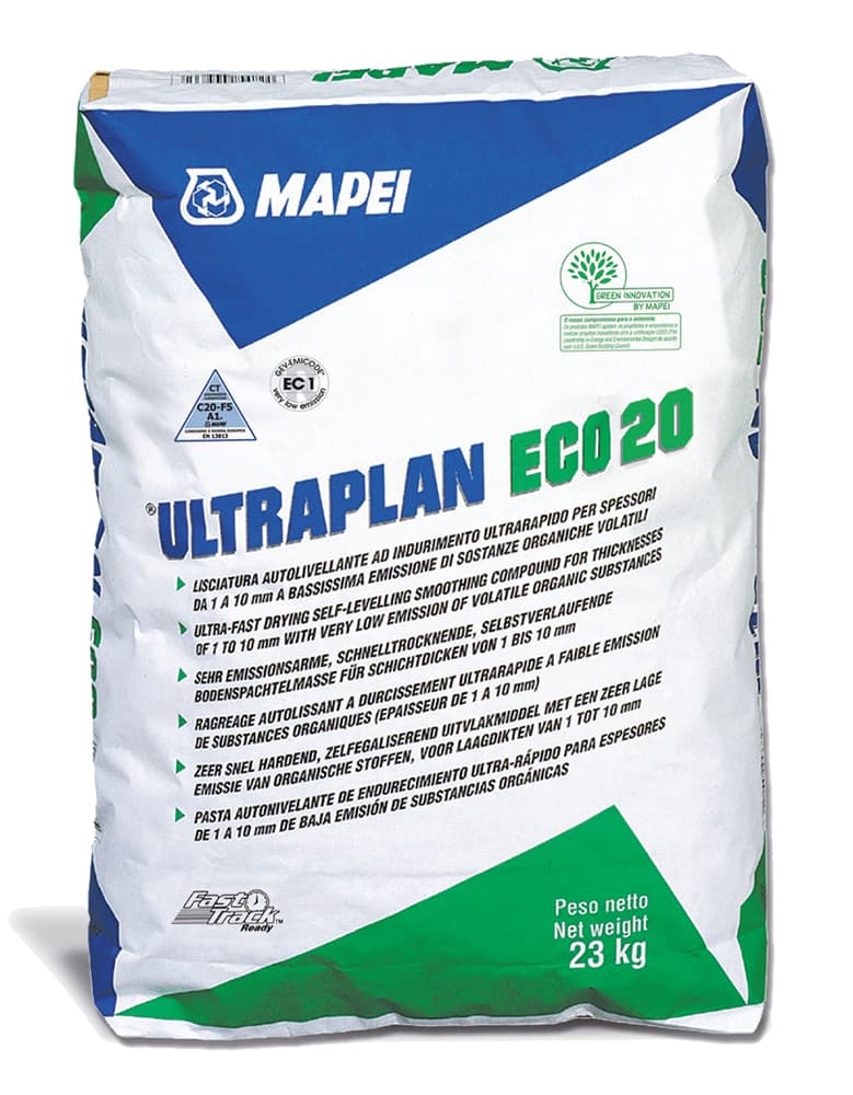 Ultraplan Eco 20 je rychleschnoucí a rychle tuhnoucí samonivelační hmota na bázi cementu, určená pro vyrovnávání a vyhlazování nových i stávajících podkladů v tloušťkách od 1 do 10 mm. Ultraplan Eco 20 lze aplikovat v tloušťkách do 10 mm v jedné vrstvě, aniž by docházelo ke smršťování nebo vzniku rýh či trhlin. Vykazuje vysokou odolnost proti intenzivnímu provoznímu zatížení a je vhodný pro prostory s pojezdem kolečkových židlí, vozíků nebo jiným nábytkem na kolečkách a je vhodný na podlahové vytápění.