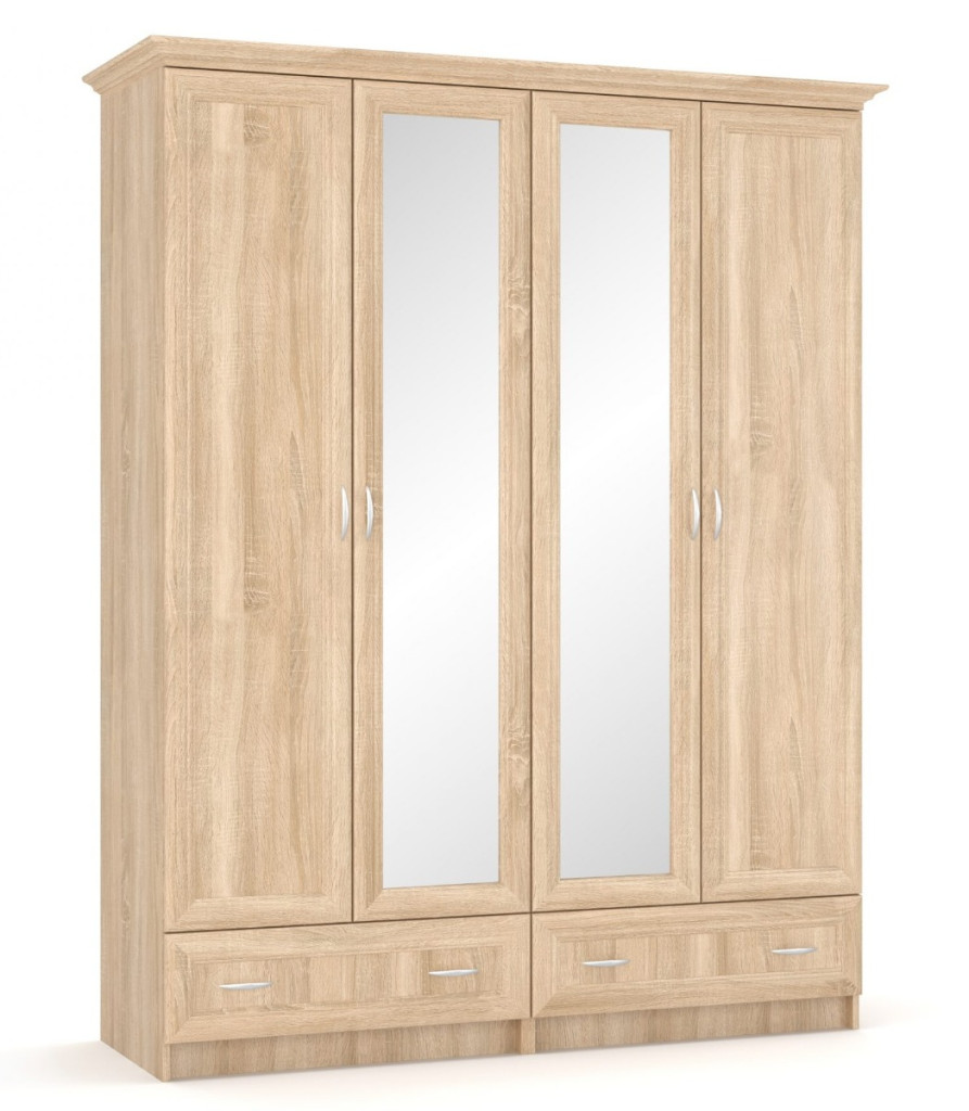 Dotaz na produkt Na splátky ještě dnesŠatní skříň čtyřdveřová z ložnicové řady. Na dvou prostředních dveřích skříně jsou zrcadla, ve spodní části skříně jsou dvě praktické zásuvky. Jemné orámování na čele nábytku dodá Vašemu interiéru eleganci. Šatní skříň je vyrobena z kvalitní LTD desky s MDF prvky v barvě dub sonoma. Nabídka komponentů této sektorové řady umožňuje sestavit si nábytek do ložnice nebo studentského pokoje dle vlastních představ. Dodáváme v demontovaném stavu.