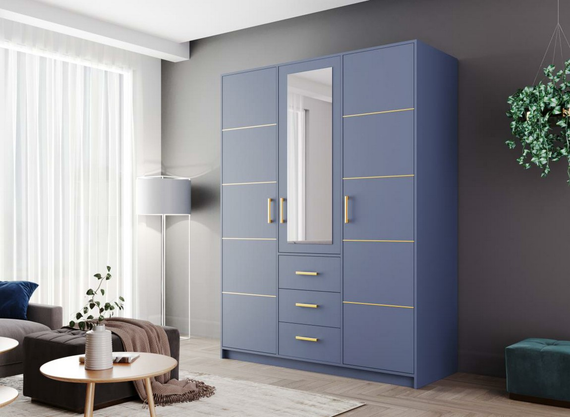 Dotaz na produkt Na splátky ještě dnesŠatní skříň 3-dveřová v moderním provedení. Korpus i dvířka jsou z kvalitního LTD v barvě pastelově modré. Skříň obsahuje praktické zrcadlo. Dveře skříně jsou dekorovány tenkými černými lamelami. Uspořádání polic viz. perokresba. Dodáváme v demontovaném stavu.
