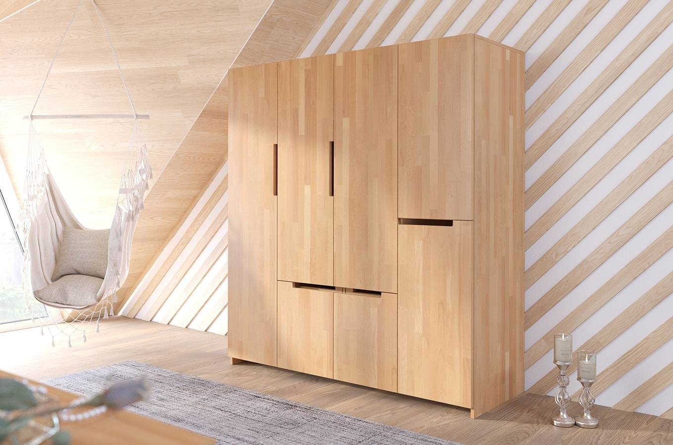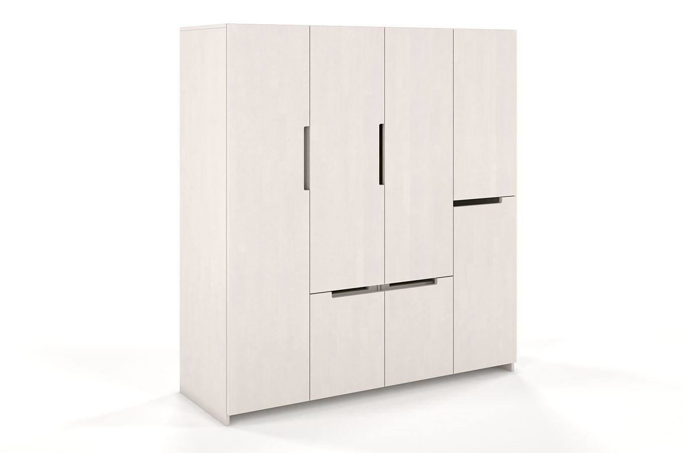 Masivně vyrobená dřevěná skříň - ideální pro ložnici, pokoj a dokonce i předsíň. Za jeho dveřmi je prostor rozdělený na tři části se třemi tyčemi, dvěma policemi a 5 zásuvkami. Originálním a neobvyklým řešením je použití nezávislých a asymetricky uspořádaných dveří, které usnadňují přístup k zásuvkám, lištám a policím bez nutnosti otevírání celé skříně. Je to vynikající kus nábytku, ve kterém snadno najdeme vhodné místo pro uložení dlouhých šatů a kratších pánských obleků.