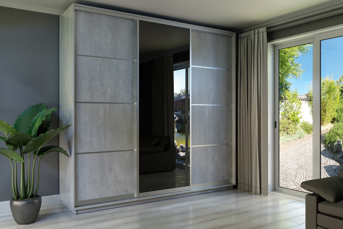 Dotaz na produkt Na splátky ještě dnesŠatní skříň s posuvnými dveřmi v moderním provedení. Nezvyklá výška 220 cm Vám nabídne větší úložný prostor. Korpus i dveře jsou z kvalitní LTD desky v barvě stříbrná šedá. Skříň má aluminiové kování a lišty, středové dveře jsou osazeny elegantním grafitovým zrcadlem, které upoutá Vaši pozornost. Dodáváme v demontovaném stavu.