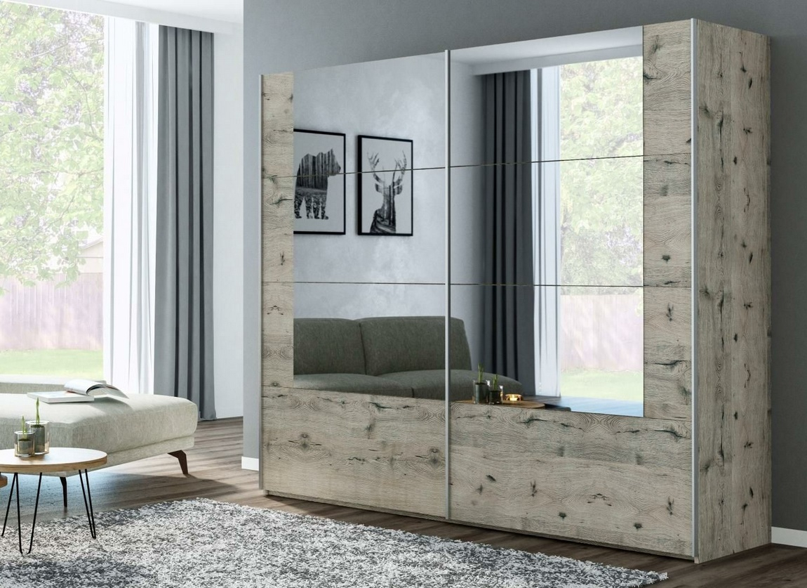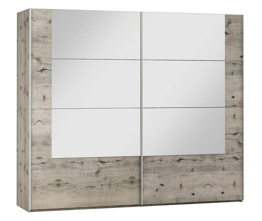 Dotaz na produkt Na splátky ještě dnesŠatní skříň s posuvnými dveřmi v moderním provedení vhodná do monochromatického interiéru. Korpus i dvířka jsou z kvalitní LTD desky v barvě dub wellington, ve středové části jsou doplněné zrcadlem. Uspořádání polic viz. obrázek. Dodáváme v demontovaném stavu.