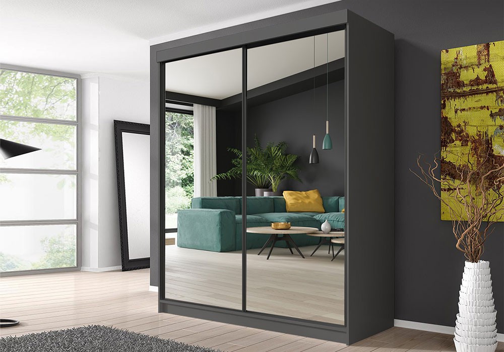 Moderní prostorná posuvná šatní skříň se zrcadly. Použitý systém posuvných dveří usnadní každodenní používání členům domácnosti. Ideální do ložnice, haly nebo chodby. Velká kapacita a funkčnost v kombinaci s moderním designem - to jsou hlavní vlastnosti. Skříň je 2-dveřová, má dva funkční prostory s policemi a věšákem na oblečení. Šatník využívá velmi pevný systém posuvných dveří (kovová vedení + válečky na ložiskách), díky kterým se dveře pohybují hladce, lehce a bez problémů.