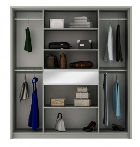 Dotaz na produkt Na splátky ještě dnesŠatní skříň čtyřdveřová v moderním provedení vhodná do monochromatického interiéru. Korpus i dvířka jsou z kvalitní LTD desky v barvě platinum, ve středové části doplněné zrcadlem. Uspořádání polic viz. obrázek. Dodáváme v demontovaném stavu.