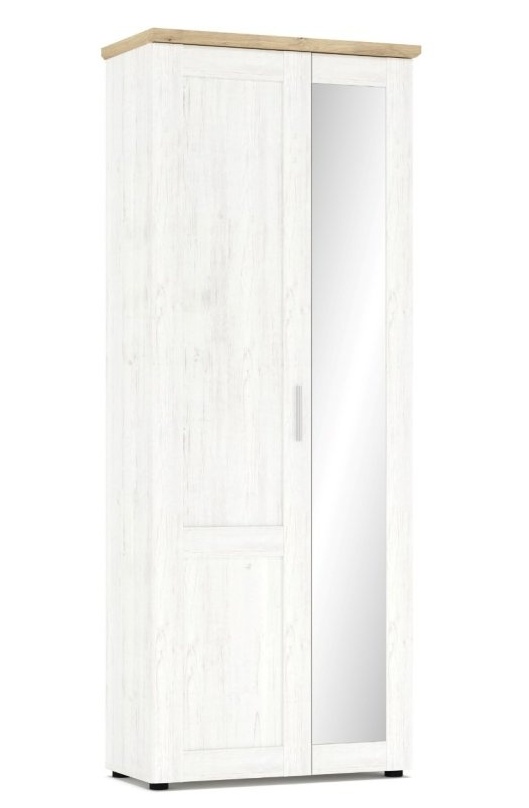 Skříň je dvoudveřová se zrcadlem. Uvnitř se nacházejí dvě police a jeden výsuvný věšák.