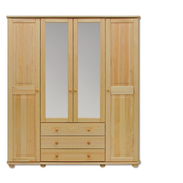 Tato skříň je prostorná a moderní, bude dekorativním i funkčním prvkem interiéru. Šatní skříň byla rozdělena do 2 segmentů. V jejich bočních částech jsou navrženy symetricky uspořádané police a ve střední části je tyč na ramínka. Tři prostorné zásuvky umístěné ve střední části skříně se hodí pro uložení méně často používaných předmětů. Velká zrcadlová čela nejen krásně vypadají, ale také opticky zvětšují interiér. Skleněné panely dokonale odrážejí světlo, a proto je místnost jasnější.