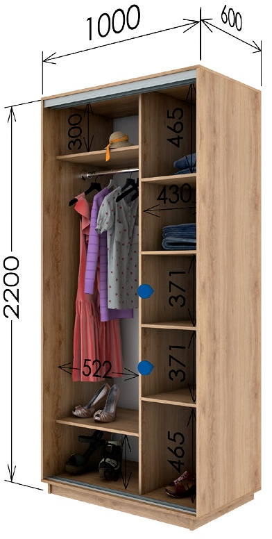 Šatní skříň s posuvnými dveřmi nabízí jednoduché a elegantní provedení. Skříň se díky svým rozměrům vejde i do malých prostorů. Korpus i dveře jsou z kvalitní LTD desky v barvě bílá diamant, přední dveře jsou posuvné s vloženými skleněnými pásy. Nezvyklá výška 220 cm nabídne opravdu dostatek prostoru. Vnitřní rozložení nabízí police a šatní tyč viz. obrázek. Skříň má aluminiové kování a lišty. Boční regál není v ceně, možnost dokoupení jako i praktické zásuvky do vnitřního prostoru skříně (modrá barva na perokresbě naznačuje, kam lze zásuvky umístit), obojí naleznete v naší nabídce. Dodáváme v demontovaném stavu.