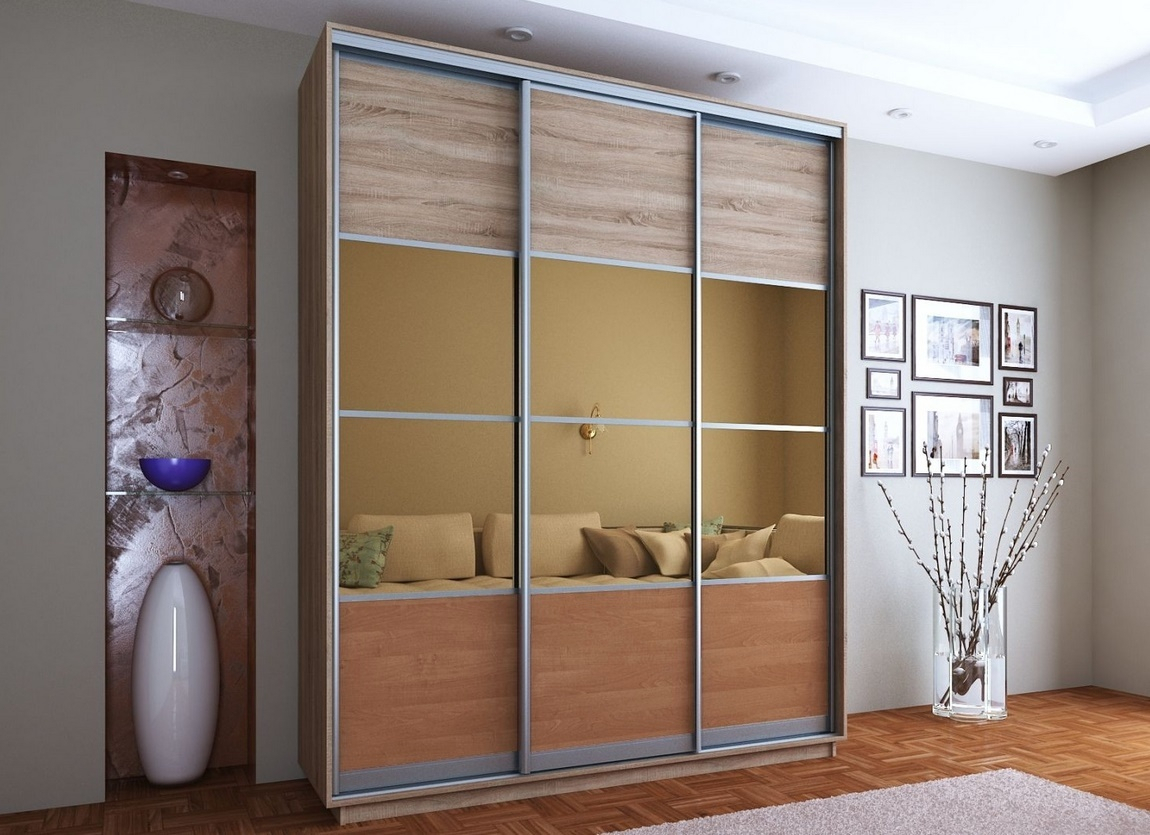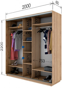 Šatní skříň se zrcadlovými posuvnými dveřmi nabízí praktické a elegantní provedení a hodí se tak do každé ložnice nebo šatny. Systém posuvných dveří usnadní každodenní používání skříně. Korpus i dveře jsou vyrobeny z kvalitní LTD desky. Korpus je v barvě dub sonoma. Horní část dveří je v barvě dub sonoma, spodní část v barvě olše a uprostřed skříň zdobí praktická zrcadla. Nezvyklá výška 220 cm nabídne opravdu dostatek prostoru. Skříň má aluminiové kování a lišty. Vnitřní rozložení nabízí police a šatní tyč viz. obrázek. Dodáváme v demontovaném stavu. Možnost dokoupení praktického bočního regálu nebo zásuvek do vnitřního prostoru skříně (modrá barva na perokresbě naznačuje, kam lze zásuvky umístit), obojí naleznete v naší nabídce.