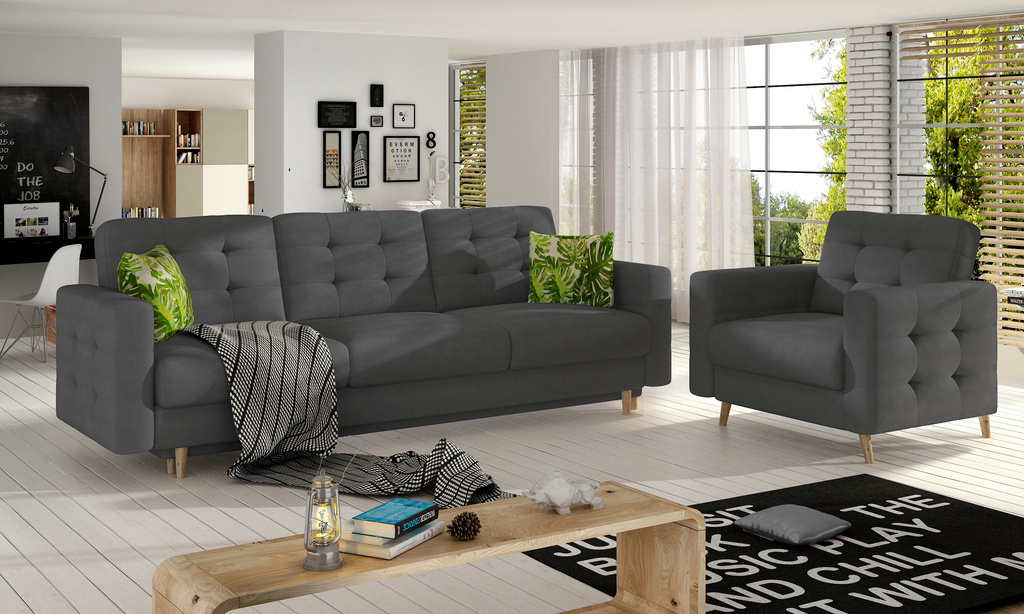 Sedací sestava Asgard obsahuje jednu třímístnou pohovku a křeslo v klasickém designu. Sestava je vyrobena z kvalitních materiálů, poskytuje pohodlné posezení u televize a zároveň se díky klasickému designu stane dominantou každého obývacího pokoje. Konstrukce sestavy je vyrobena z kombinace dřeva a dřevotřískové desky a výplň sedáků tvoří polyuretanová pěna T3030. Pohovku lze navíc rozložit a vytvořit tak spací plochu vhodnou o rozměrech 196 x 133 cm pro příležitostné přespání.