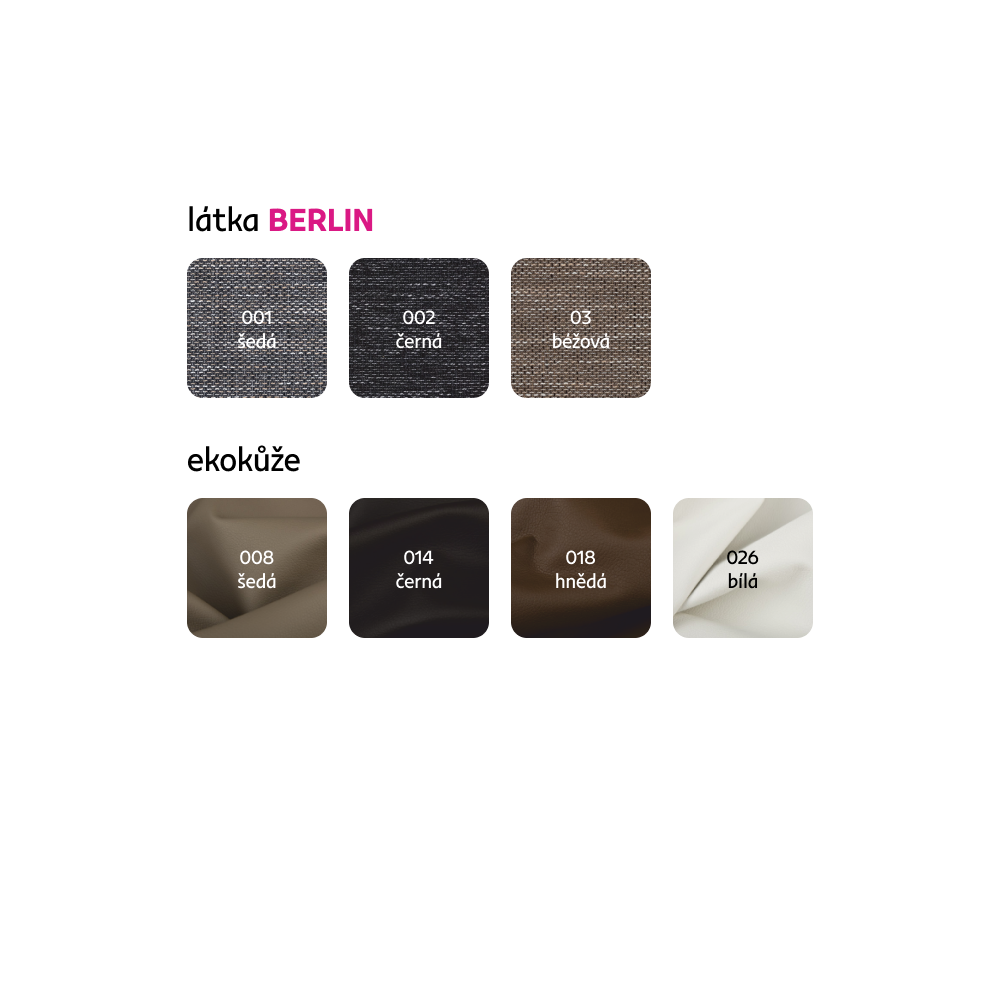 Možnost objednání v 4 barevných odstínech ekokůže a ve 4 barevných odstínech látky Berlin v ceně 20.150 Kč. . Při individuální objednávce je třeba zaplatit 20% zálohu z dané částky. Po uhrazení zálohy bude Vaša objednávka zadána do výroby. Doba dodání 6-8 týdnů.